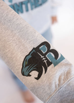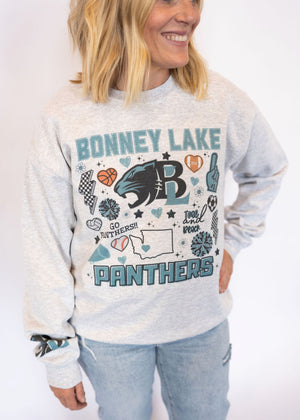 Rep your Panthers pride in cozy style! This light grey graphic crewneck is packed with school spirit—from the bold Bonney Lake Panthers print to the fun sports icons and Panther logo. Extra detail? The sleeve even features the fierce Panther head for that finishing touch.