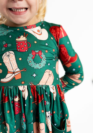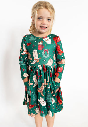 Yeehaw for the holidays! The Western Winterland Twirl Dress is a festive favorite for your little cowgirl. Featuring a vibrant green backdrop sprinkled with cowboy boots, hats, Christmas trees, wreaths, and cozy mugs of cocoa — it’s a merry mix of country charm and Christmas magic!