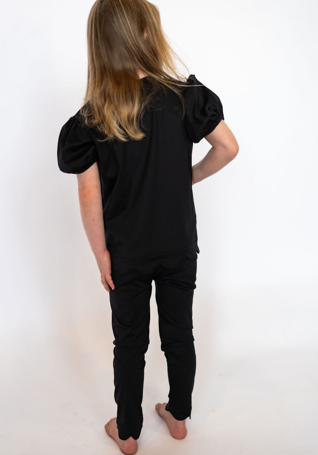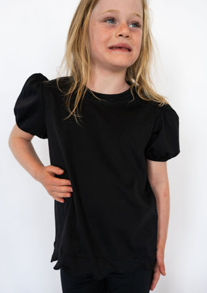 A timeless basic with a sweet twist — our Black Scalloped Tee is the perfect blend of everyday wear and adorable detail. The scalloped hem and puff sleeves make it anything but plain, while the solid black keeps it versatile for endless outfit combos.