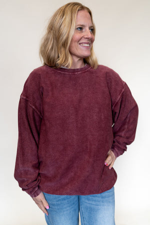 This corded crew features a soft ribbed texture, a relaxed oversized fit, and dropped shoulders that give it that perfectly slouchy, lived-in look. The fabric feels broken-in (in the best way), not stiff or bulky—aka comfy without looking like you stole it from the couch.