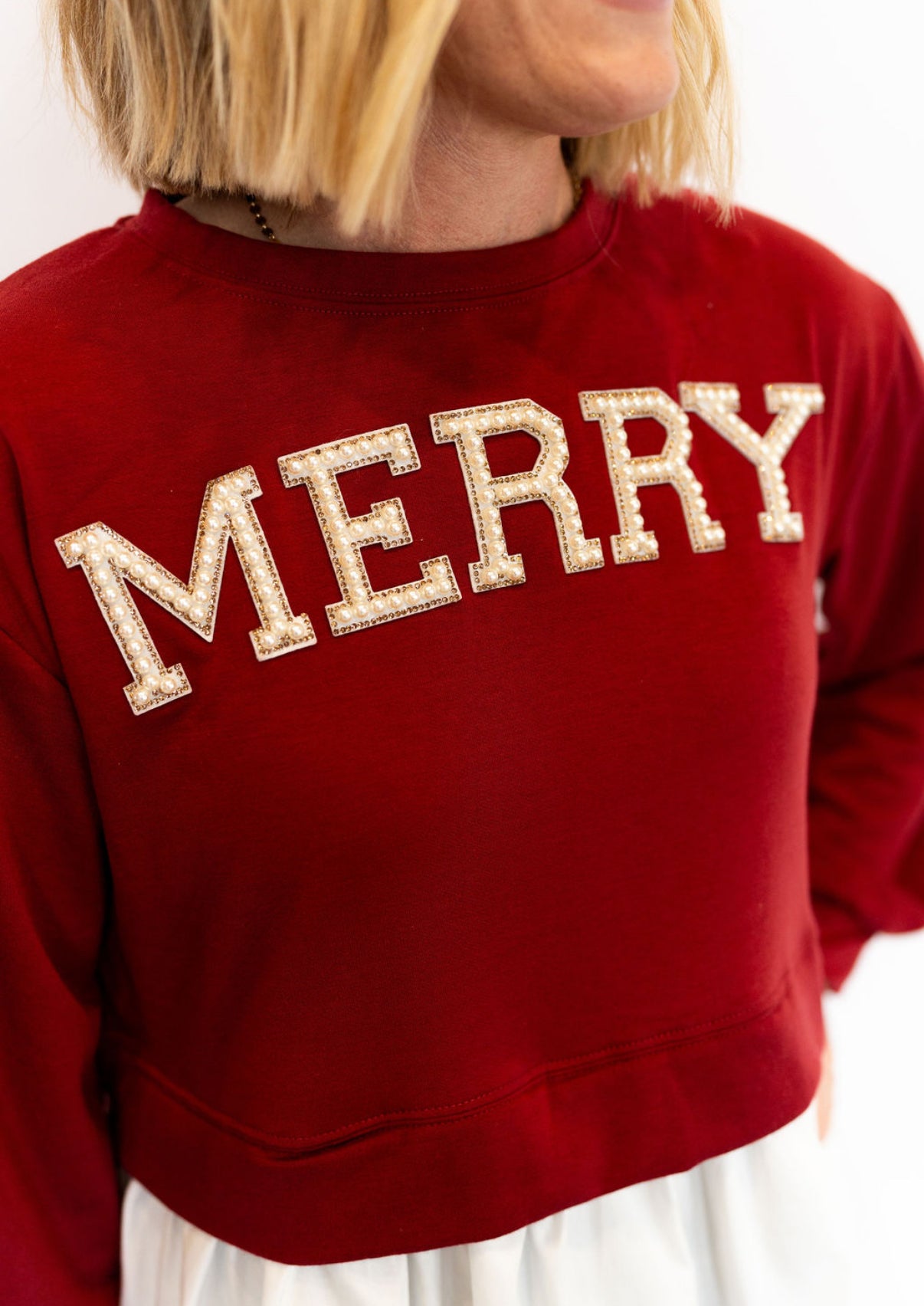 Top: soft sweatshirt material with pearl “MERRY” appliqué