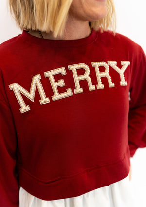 Get festive and fabulous in this adorable Simply Southern Twyla Dress! The top features a rich cranberry red sweatshirt with bold, pearl-embellished “MERRY” lettering that sparkles with holiday cheer. The bottom half gives effortless charm with a flouncy white skirt for that layered, boutique-chic look — no styling required!