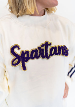 Show off that Sumner pride in the cutest, coziest way! This cream crewneck is serving sporty-meets-sparkle with a bold purple chenille “Spartans” patch outlined in gold shimmer. The striped sleeves give it that retro varsity vibe, while the relaxed fit makes it an everyday staple for game days, school runs, and “I woke up cute on accident” moments.